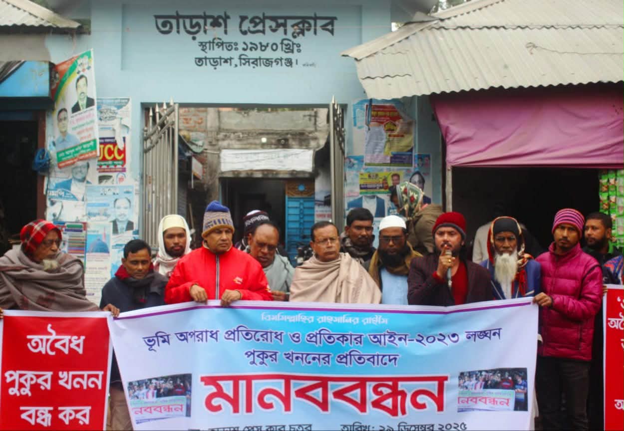 Golam Mostofa, Tarash: People from all walks of life formed a human chain in Tarash, Sirajganj, protesting the digging of ponds in agricultural land. The program was held on Monday (December 29) morning in front of Tarash Press Club under the banner of Upazila Citizens` Movement.